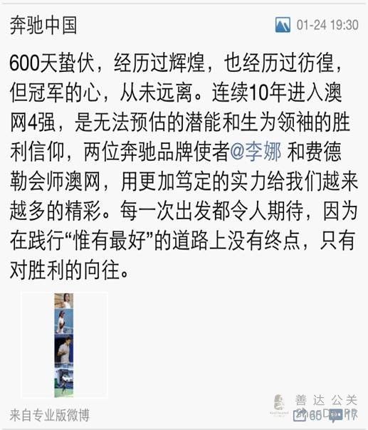 真正開始做社會化的傳播是從奔馳兩位品牌使者進(jìn)入四強(qiáng)開始,在1月24日奔馳中國發(fā)出了此次澳網(wǎng)比賽的第一條微博,主要從品牌與兩位選手的表現(xiàn)出發(fā)。緊接著直到1月26日比賽日發(fā)出了第二條微博(有著小插曲,中間費(fèi)德勒被淘汰被沒有做告知),第二條微博的內(nèi)容主要是從比賽預(yù)告以及為李娜爭取更多的支持角度出發(fā),表達(dá)了奔馳對于李娜的祝福,希望帶去更多的好運(yùn)。