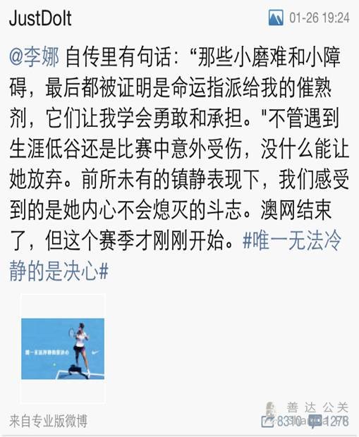 當(dāng)前位置 :善達(dá)首頁 > 關(guān)于我們 > 善達(dá)知識 > 上海公關(guān)公司:澳網(wǎng)賽場外的社會化營銷大戰(zhàn)