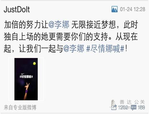 從比賽之前開始說起,以下是李娜比賽前nike的文案及配圖,還是保持nike一貫的風(fēng)格,另類風(fēng)格的小標(biāo)簽#盡情娜喊#很對年輕人的胃口,再加上微博配圖簡潔有力,清楚的表達(dá)了此次nike想要表達(dá)的意圖,文案中也體現(xiàn)了引發(fā)互動的理由,需要更多粉絲的支持,從此條微博來看,需要達(dá)到的目標(biāo)基本完成。