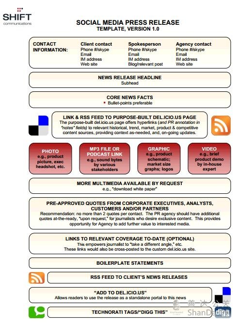 社交媒體新聞稿 (Social Media News Release, SMNR) 是由Shift Communications 的Todd Defren最先提出來的。其實更確切地描述應(yīng)是“社交媒體友好的新聞稿”。這種新聞稿貌似復(fù)雜,包含大量多媒體內(nèi)容以及相關(guān)資訊鏈接,如公司其他新聞稿和專家引述等。這種對格式的強(qiáng)調(diào)使得許多人望而卻步,這種現(xiàn)象時至今日依然存在。