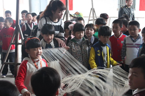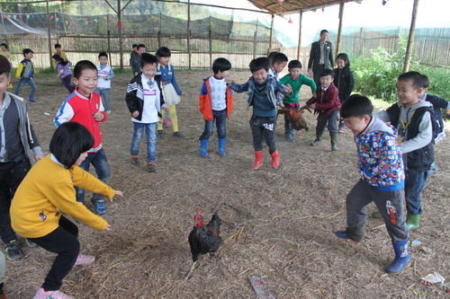 一路上,孩子們歡聲笑語,歌聲不斷,不知不覺便抵達了目的地——瑞安谷歌青少年教育基地。老天也很厚愛孩子們,雨竟然停了,天空放晴。到達谷歌后,孩子們首先體驗了傳統(tǒng)手工藝——做紗面。在體驗過程中,孩子們表現(xiàn)出非常高的興致,在老伯伯的細心指導示范下,個個儼然像似熟練的小技工,做得像模像樣。在游戲環(huán)節(jié)中,最有趣的活動還數(shù)“捉公雞”,在圍有四、五只大公雞的圍欄中,孩子們使出渾身解數(shù),追趕著、捉拿著,追得大公雞四處逃命,無處藏身…..最后,只好乖乖地蹲在圍欄角落,任憑發(fā)落,孩子們?yōu)樽约韩@得的“戰(zhàn)利品”開心極了!