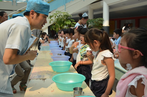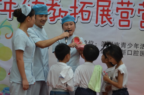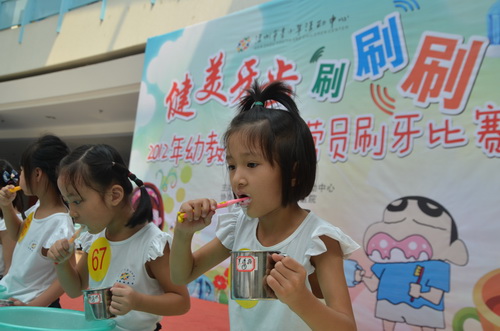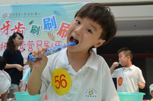 為了促進(jìn)營員口腔健康,提升營員的口腔保健知識,養(yǎng)成正確刷牙的好習(xí)慣,市青少年活動(dòng)中心幼教拓展營在9月20日全國愛牙日舉辦了一場別開生面的刷牙比賽,活動(dòng)寓教于樂,活動(dòng)策劃,贏得了家長及孩子們的熱烈歡迎?! ?br /> 活動(dòng)開始后,溫州市中新口腔醫(yī)院的醫(yī)生先給營員們講解了口腔保健知識并示范正確刷牙方法,再依次分組比賽,143名參賽營員被分成7組,無論男孩女孩,上陣比賽一點(diǎn)不打怵。左刷刷右刷刷,上刷刷下刷刷……牙齒刷得是否潔凈不知道,動(dòng)作倒是有板有眼,讓一旁的老師們看了忍俊不禁。評委團(tuán)給每位參賽選手的刷牙方法打了分?jǐn)?shù)并頒發(fā)了獎(jiǎng)品。