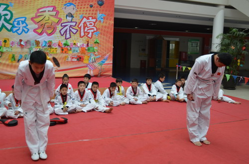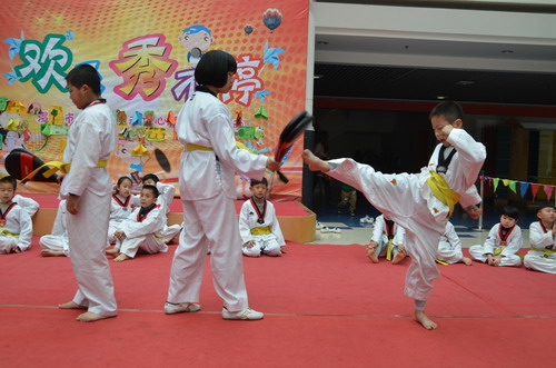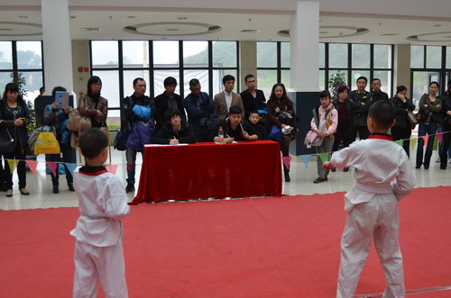 2012年3月17日上午, 40余名學(xué)員在中心一樓大廳參加跆拳道等級考試。他們分別根據(jù)自己的水平報(bào)考黃帶、黃綠帶、綠帶等級別。
