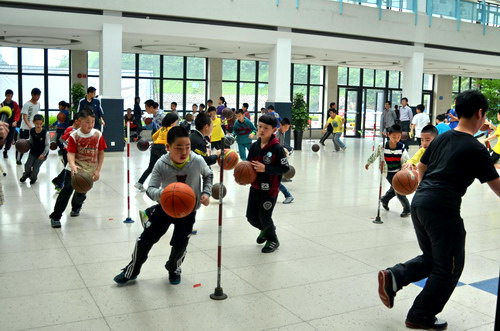 4月21日上午,籃球班60多名學(xué)員在老師們的組織下在中心一樓大廳舉行了趣味籃球賽活動。首先進行的是運球過障礙比賽,活動策劃,在裁判員的一聲哨響之后,學(xué)員們排成了一條長龍,沿著標桿魚貫而入式的運球表演贏得了在場家長學(xué)員們的陣陣掌聲。中場休息的時候,一位學(xué)員的轉(zhuǎn)球表演秀更是將比賽帶入了高潮。