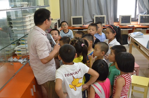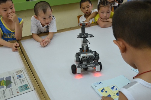 在體驗(yàn)課上,來(lái)自五湖四海的36名“小侯鳥”分成三個(gè)年段,分別在三個(gè)班級(jí)體驗(yàn)樂(lè)高機(jī)器人的樂(lè)趣。他們?nèi)耸忠慌_(tái)自制的汽車模型,在老師的指導(dǎo)下進(jìn)行電腦編程,再將編好的程序輸進(jìn)汽車?yán)?,這樣,汽車就能跑起來(lái)了。在湖南上小學(xué)三年級(jí)的李洋一邊對(duì)著電腦屏幕編輯,一邊說(shuō):“以前沒(méi)有上過(guò)機(jī)器人課,感覺(jué)很新鮮,很好玩。”不一會(huì)兒工夫,她的小汽車就能下地跑了,前進(jìn)、后退,還能原地轉(zhuǎn)圈兒呢。小朋友們迫不及待地把自己的作品拿到走廊上,和其他人一比高下。來(lái)自湖北的一年級(jí)學(xué)生劉子揚(yáng)捧著和小伙伴合作的成品,得意洋洋地說(shuō),這里比在家好玩多了!子揚(yáng)的爸爸也對(duì)課程很滿意:“孩子在家整天就是看電視,上這么一堂課,動(dòng)手又動(dòng)腦,還能培養(yǎng)團(tuán)隊(duì)意識(shí)。”
