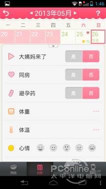 對女性用戶而言,使用這樣一款A(yù)PP可準(zhǔn)確記錄和推算月經(jīng)周期,并獲得較為全面、詳盡的小貼士,以解決各類生理難題。它提供了日歷功能,安全期、月經(jīng)期、危險期一目了然,此外,用戶還可以錄入其他更詳細(xì)的信息,例如是否同房、是否吃避孕藥、體重、體溫、心情等等,便于全面記錄用戶的身體狀況,以建立詳細(xì)的個人檔案。