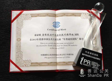 在剛剛結(jié)束的中國(guó)國(guó)際公共關(guān)系協(xié)會(huì)(CIPRA)舉辦的2012年度行業(yè)獎(jiǎng)項(xiàng)評(píng)選中,中青旅聯(lián)科公關(guān)公司“保護(hù)音像表演外交會(huì)議技術(shù)保障組”因其在該項(xiàng)目中的出色表現(xiàn),榮獲2012年度最佳團(tuán)隊(duì)獎(jiǎng)。