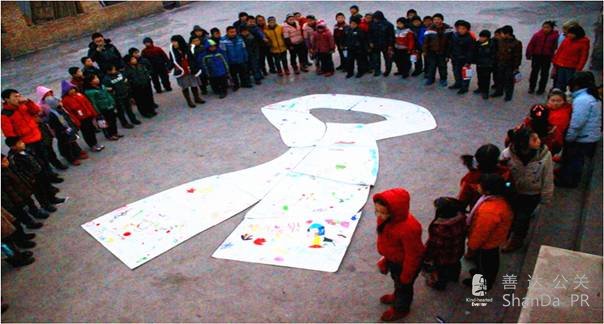 山西五臺(tái)縣黑崖堂小學(xué)130多名師生和凱維公關(guān)的愛心大使共同繪制巨型“夢(mèng)想圍脖”。