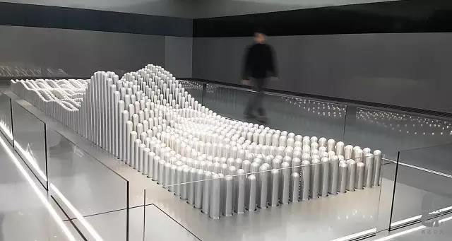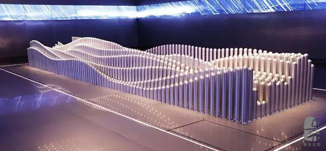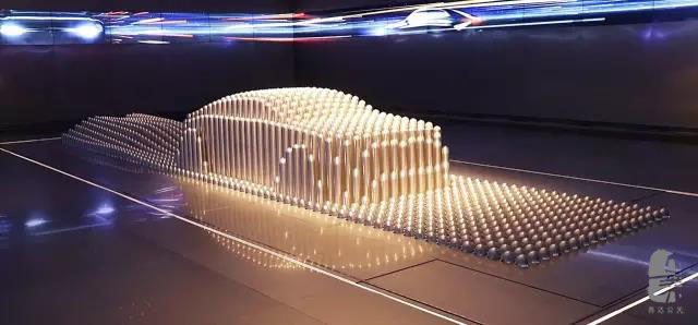 在HYUNDAI MOTORSTUDIO的一處15坪左右大的狹長型空間里,觀眾首先看到的是牆壁四周水平環(huán)繞的多具液晶螢?zāi)唬孛嬷醒雱t是內(nèi)建的1141根銀柱,展覽開始時內(nèi)建圓柱體會配合著名音樂及牆上螢?zāi)坏墓庥傲鲃樱舷聰[動集結(jié)形成波浪狀、不規(guī)則狀,甚至是車體之型態(tài),用以呈現(xiàn)流體雕塑的驅(qū)動、設(shè)計概念與無限可能性。