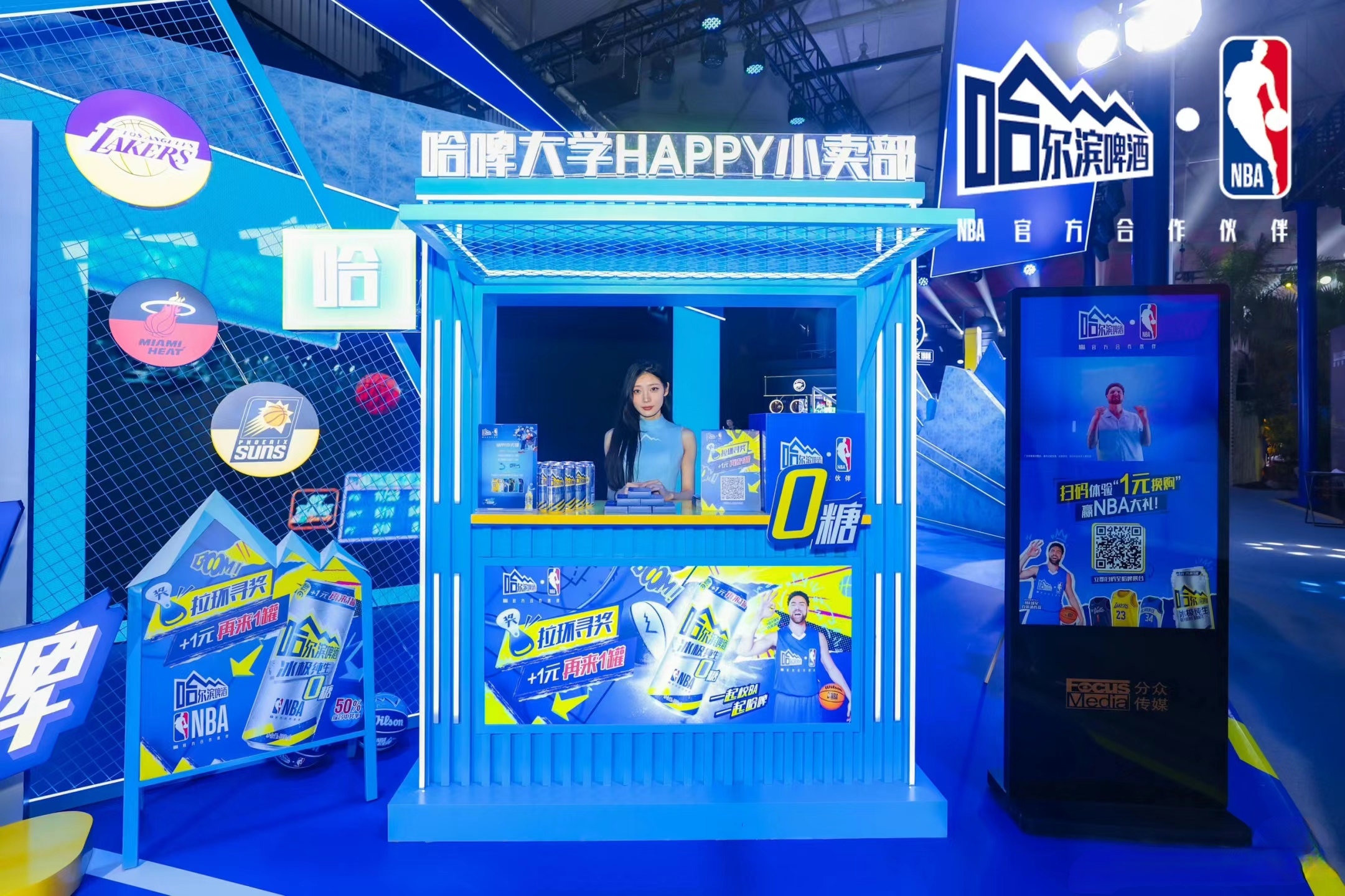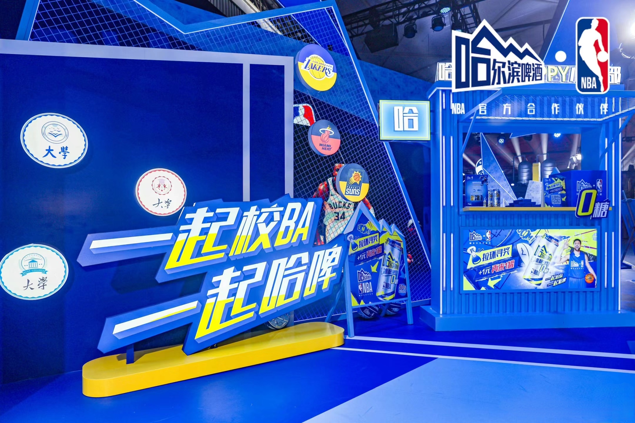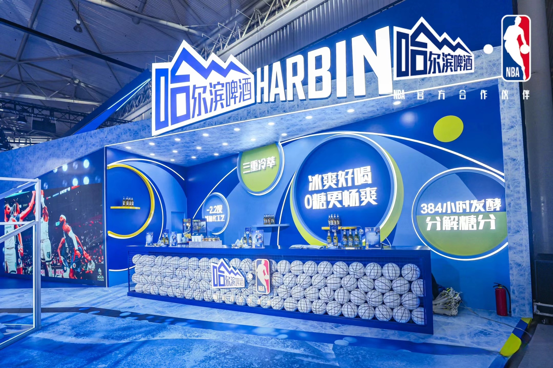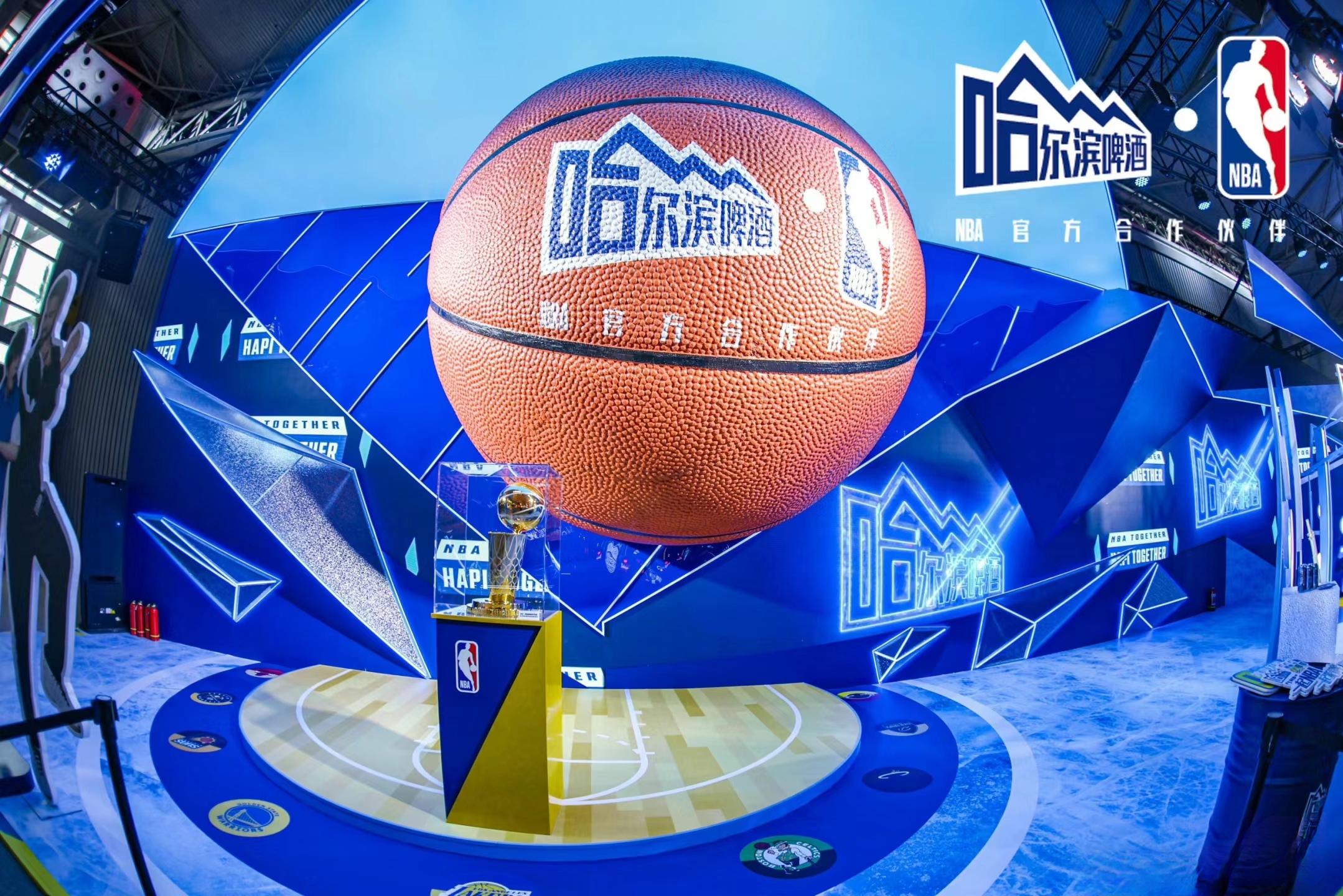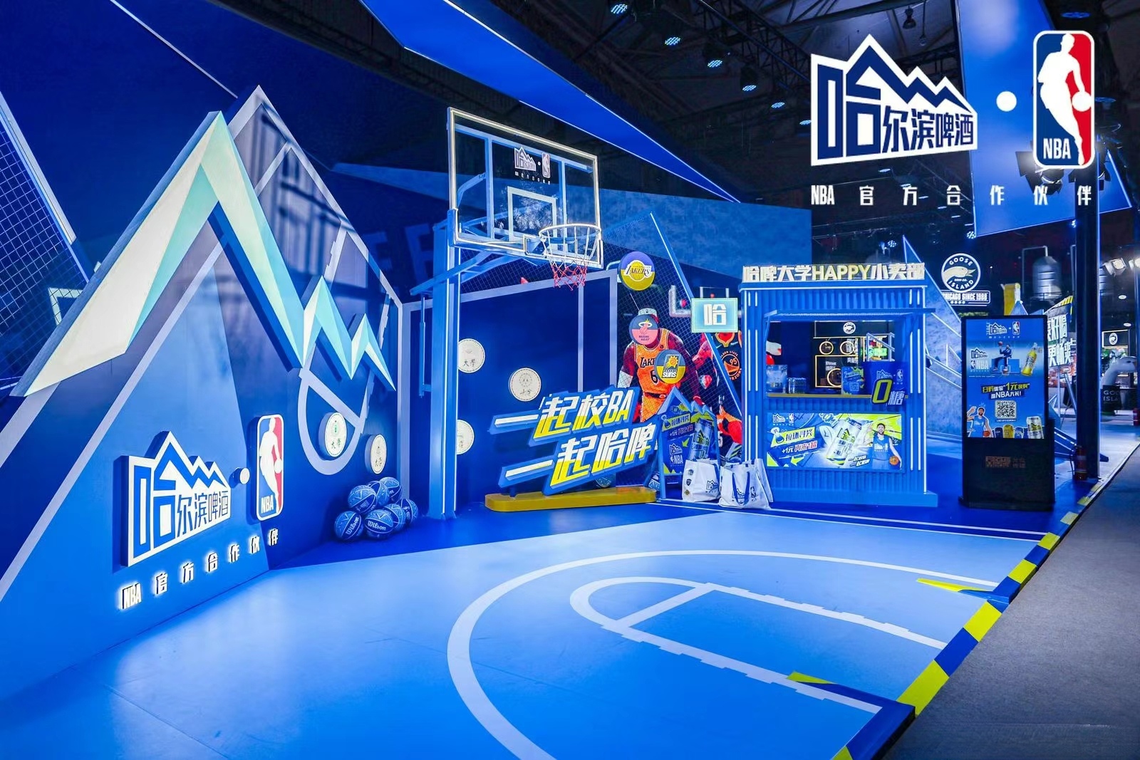 場(chǎng)地布置和舞臺(tái)設(shè)計(jì)緊扣籃球文化,并融入大量與啤酒的設(shè)計(jì)元素。現(xiàn)場(chǎng)布置了很多籃球和啤酒元素的互動(dòng)裝置,如籃球架 ,啤酒桶、酒杯等,展現(xiàn)哈爾濱啤酒深厚的文化底蘊(yùn)。以及采用NBA的藍(lán)色調(diào)為主的熱烈的色調(diào)和燈光效果,營(yíng)造出濃厚的啤酒文化和籃球運(yùn)動(dòng)氛圍。
